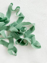 Item #467 is a Silk Classic Ribbon in a mid-tone cool green color. It's made with 100% Silk Crepe, has a lightweight feel with a matte-like texture. This is a one-of-a-kind, single batch color, and will not be available for purchase after selling out. This item ships in as-is condition, without our signature packaging, making it possible for us to pass along a deeper discount to you.