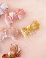 Meet our Silk Velvet Ribbon: Buttery soft, it’ll melt the coldest of hearts. It’s our heaviest-weight ribbon, mixed with rayon for a sexy texture. Our vow? Soft, romantic colors, but make them luxe, thanks to a velvety sheen on one side and hand-frayed raw edges. Well, color us intrigued.